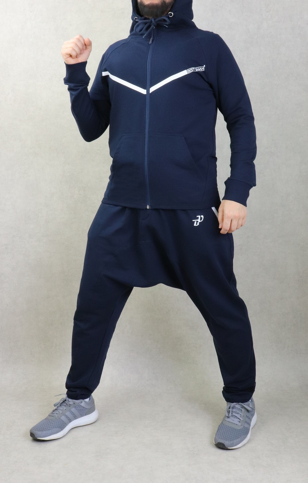 Veste couleur bleu marine, plus longue à l'arrière qu'à l'avant avec bandes blanche et inscription BEST UMMAH. Tissu léger coton strech de qualité et doux. Deux poches sur les côtés. Capuche doublée avec cordon.