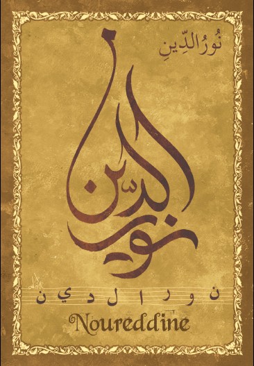 Jolie carte postale représentant le prénom arabe Noureddine calligraphié en arabe ainsi que son épellation lettre par lettre en arabe. Derrière la carte postale se trouve la signification du prénom.