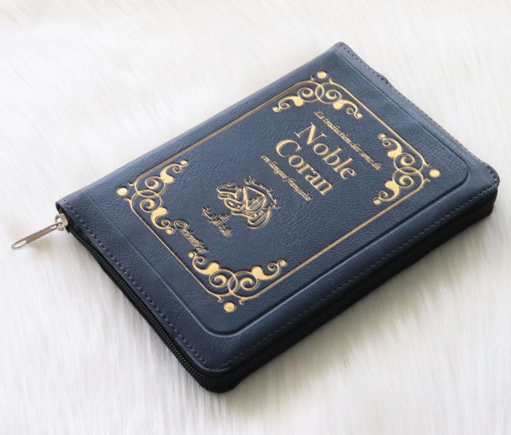 Très beau Coran au format poche 12 x 17 cm avec fermeture zip pratique pour emporter avec soit (Le Coran est protégé par sa couverture plastifiée étanche bleu-nuit). Avec marque page en soie intégré.