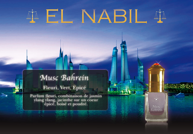 Parfum El Nabil "Musc Bahrein" : Fleuri, Vert, Epicé... Combinaison de jasmin ylang ylang, jacinthe sur un coeur épicé, boisé et poudré.