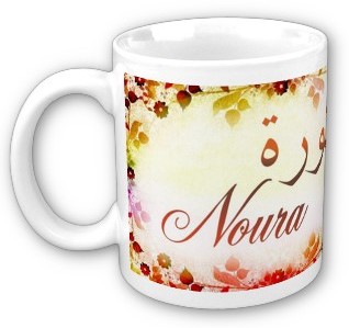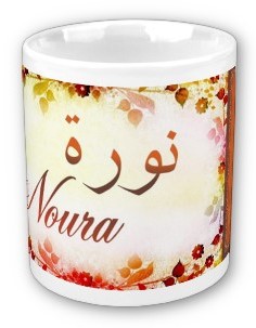 Mug avec le prénom Noura calligraphié en arabe (نورة) ainsi que son épellation lettre par lettre en arabe.