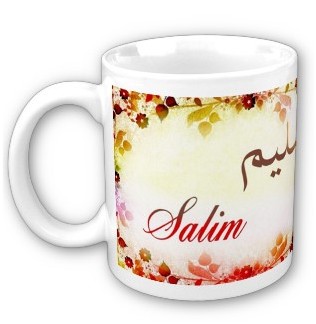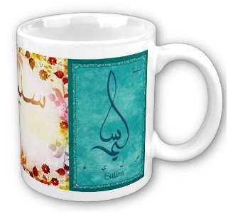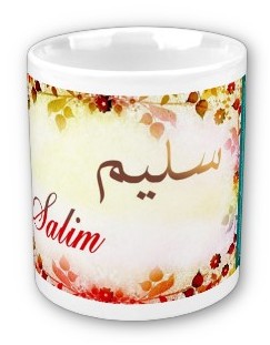 Mug avec le prénom "Salim" calligraphié en arabe (سليم) ainsi que son épellation lettre par lettre en arabe.