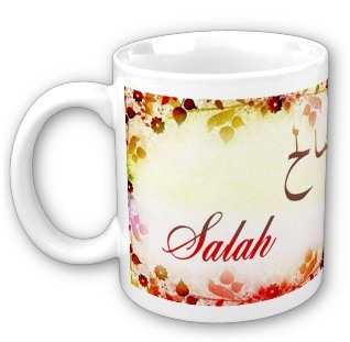 Mug avec le prénom "Salah" calligraphié en arabe (صالح) ainsi que son épellation lettre par lettre en arabe.