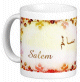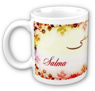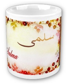 Mug avec le prénom "Salma" calligraphié en arabe (سلمى) ainsi que son épellation lettre par lettre en arabe.