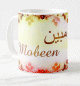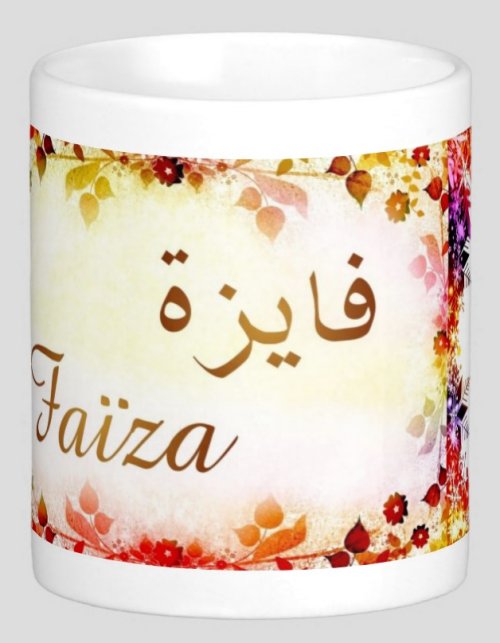 Mug avec le prénom "Faïza" écrit en français, en arabe (فايزة) et calligraphié de façon artistique en arabe sur la partie droite.