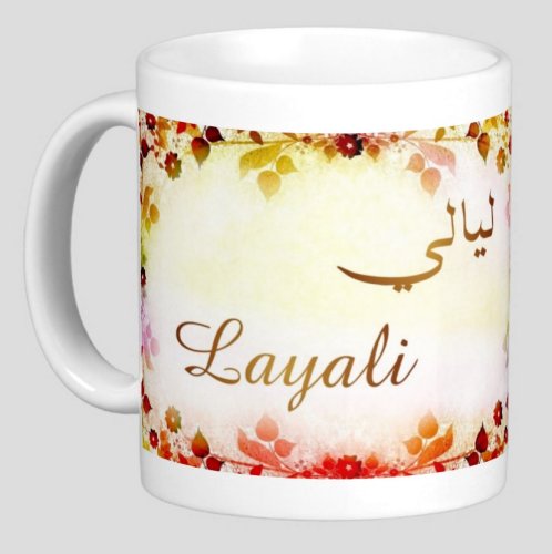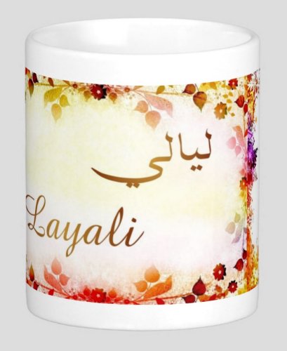 Mug avec le prénom "Layali" écrit en français, en arabe (ليالي) et calligraphié de façon artistique en arabe sur la partie droite.