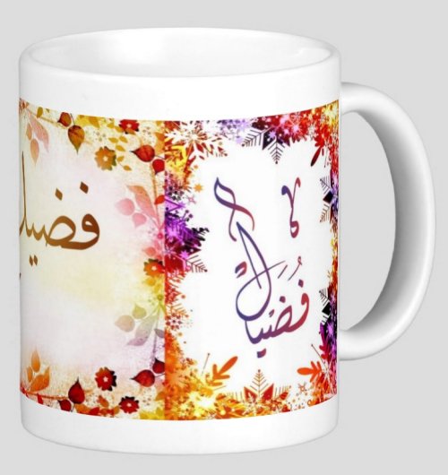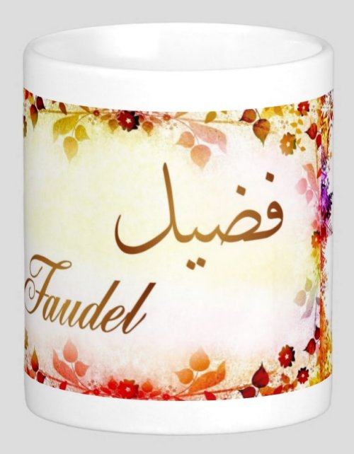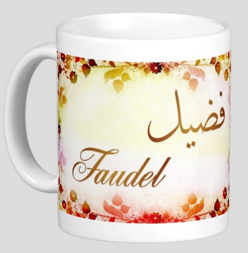 Mug avec le prénom "Faudel" écrit en français, en arabe (فضيل) et calligraphié de façon artistique en arabe sur la partie droite.