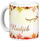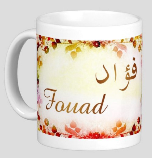 Mug avec le prénom "Fouad" écrit en français, en arabe (فؤاد) et calligraphié de façon artistique en arabe sur la partie droite.