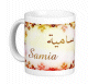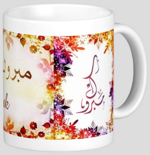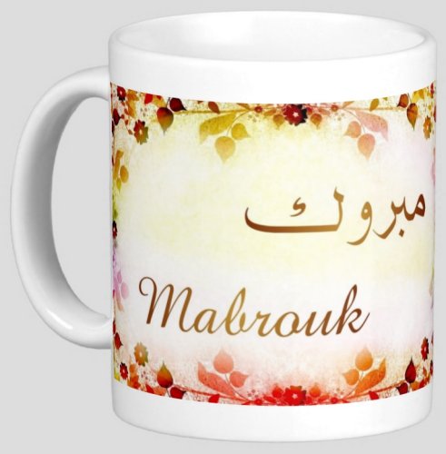 Mug avec le prénom "Mabrouk" écrit en français, en arabe (مبروك) et calligraphié de façon artistique en arabe sur la partie droite.