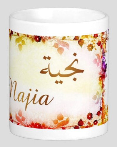 Mug avec le prénom "Najia" écrit en français, en arabe (نجية) et calligraphié de façon artistique en arabe sur la partie droite.