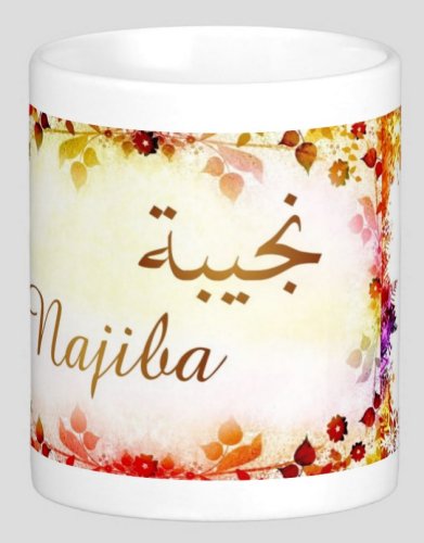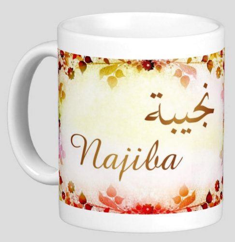 Mug avec le prénom "Najiba" écrit en français, en arabe (نجيبة) et calligraphié de façon artistique en arabe sur la partie droite.