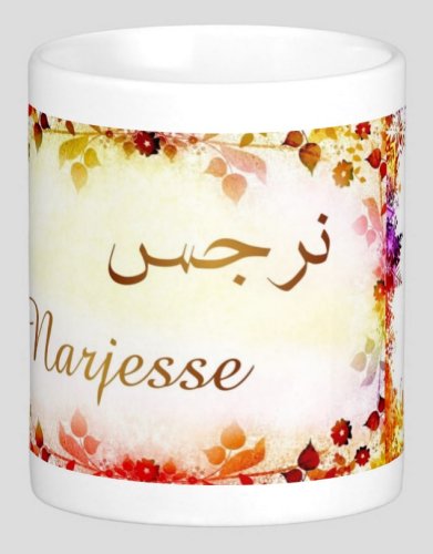Mug avec le prénom "Narjesse" écrit en français, en arabe (نرجس) et calligraphié de façon artistique en arabe sur la partie droite.