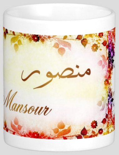 Mug avec le prénom "Mansour" écrit en français, en arabe (منصور) et calligraphié de façon artistique en arabe sur la partie droite.