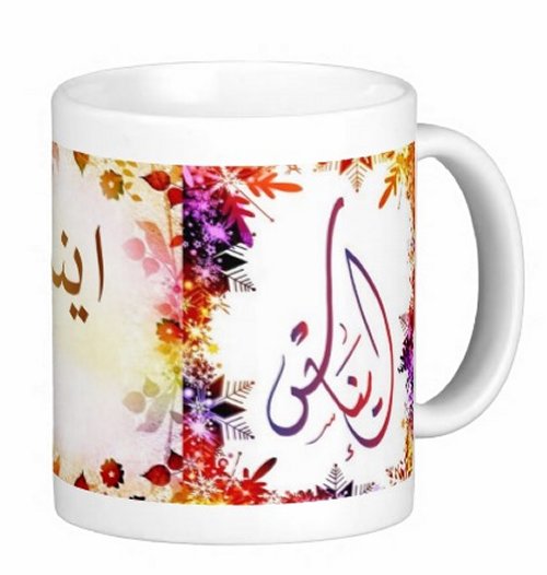 Mug avec le prénom "Inas" écrit en français, en arabe (ايناس) et calligraphié de façon artistique en arabe sur la partie droite.