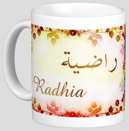 Mug avec le prénom "Radhia" écrit en français, en arabe (راضية) et calligraphié de façon artistique en arabe sur la partie droite.
