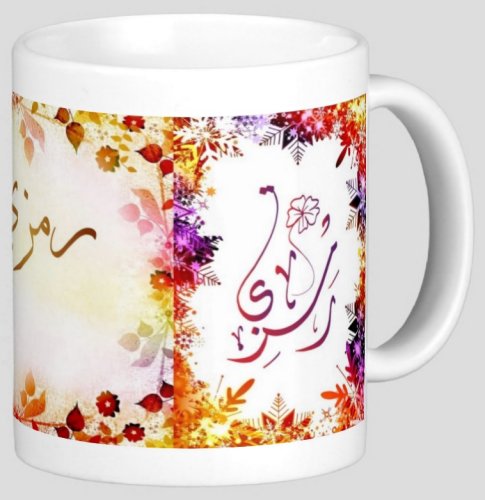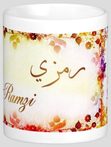 Mug avec le prénom "Ramzi" écrit en français, en arabe (رمزي) et calligraphié de façon artistique en arabe sur la partie droite.