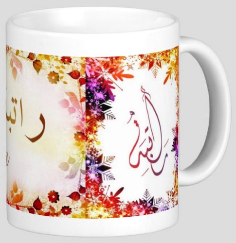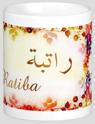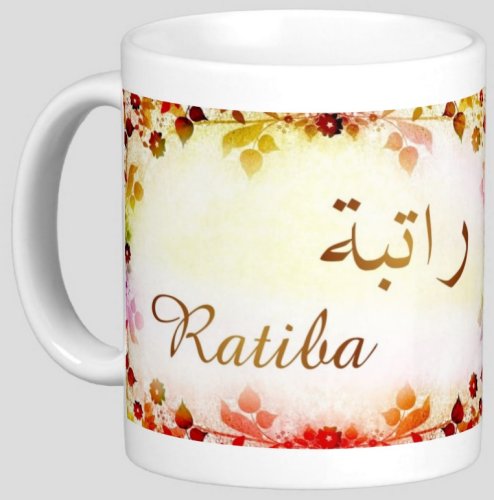 Mug avec le prénom "Ratiba" écrit en français, en arabe (راتبة) et calligraphié de façon artistique en arabe sur la partie droite.