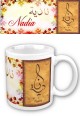 Mug avec le prénom "Saliha" écrit en français, en arabe (صالحة) et calligraphié de façon artistique en arabe sur la partie droite.