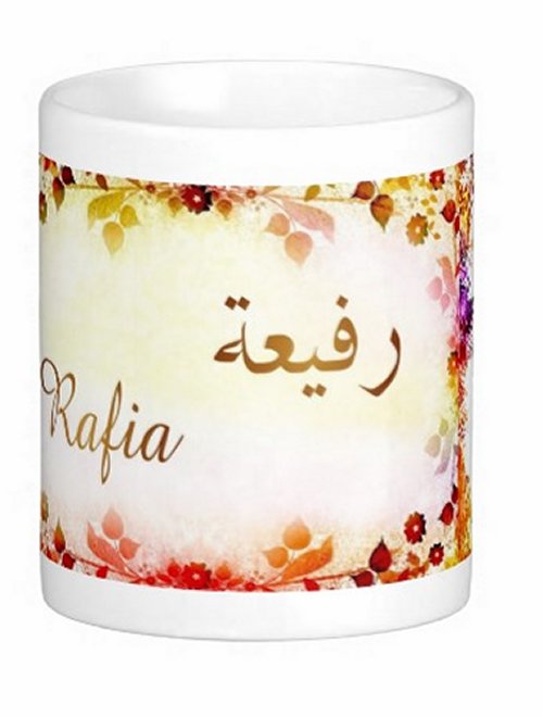 Mug avec le prénom "Rafia" écrit en français, en arabe (رفيعة) et calligraphié de façon artistique en arabe sur la partie droite.