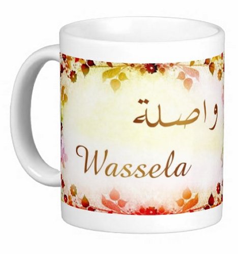Mug avec le prénom "Wassila" écrit en français, en arabe (واصلة) et calligraphié de façon artistique en arabe sur la partie droite.