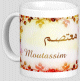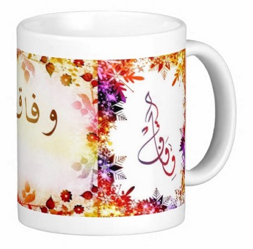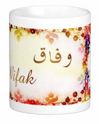 Mug avec le prénom "Wifak" écrit en français, en arabe (وفاق) et calligraphié de façon artistique en arabe sur la partie droite.