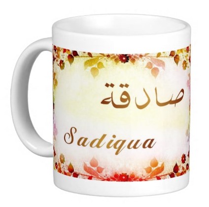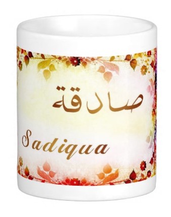 Mug avec le prénom "Sadiqua" écrit en français, en arabe (صادقة) et calligraphié de façon artistique en arabe sur la partie droite.