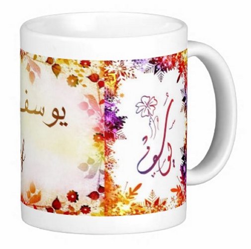 Mug avec le prénom "Youcef" écrit en français, en arabe (يوسف) et calligraphié de façon artistique en arabe sur la partie droite.