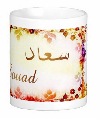 Mug avec le prénom "Souad" écrit en français, en arabe (سعاد) et calligraphié de façon artistique en arabe sur la partie droite.