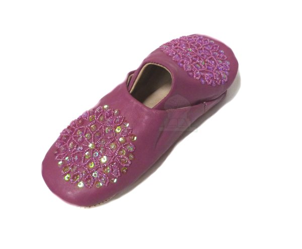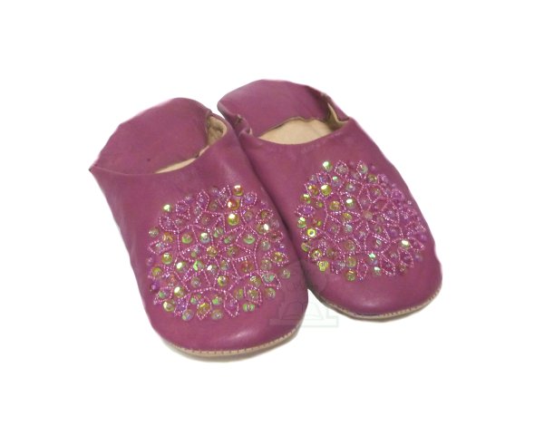 Babouche traditionnelle marocaine, style berbère, en cuir de couleur violette pour femmes. Ces babouches possèdent un bout - une extrémité - arrondi(e), pour plus de confort à l'intérieur. Elles sont décorées de jolis motifs en fleurs en strasses et en perles...