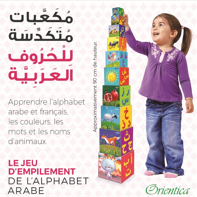 Alpha Cubes : le jeu d’empilement de l’alphabet arabe est merveilleusement illustré et est composé de dix pièces. Chaque cube varie en taille et peut être placé sur un autre bloc, votre enfant aura ainsi la possibilité de construire une tour haute de quatre-vingt-dix centimètres, ce qui lui permettra de bâtir sa confi ance, et de renforcer sa coordination et son équilibre.