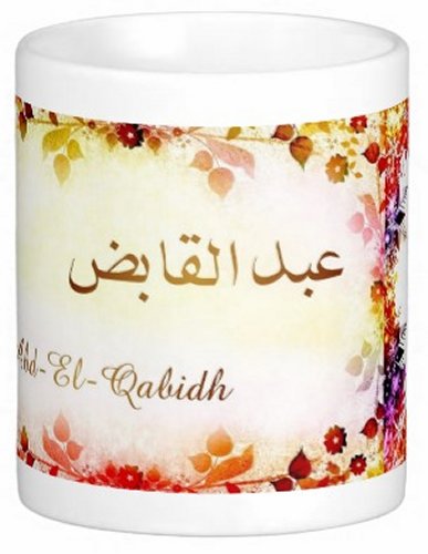 Mug avec le prénom "Abd-El-Qabidh" écrit en français, en arabe (عبد القابض) et calligraphié de façon artistique en arabe sur la partie droite.