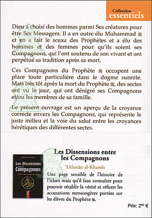 Dieu a choisi des hommes parmi ses créatures pour être ses messagers, il s'agit des Prophètes. Il a en outre élu Mohamed (Alayhi Salat wa Salam) et en a fait le sceau des Prophètes et a élu des hommes et des femmes pour qu'ils soient ses compagnons,le soutenant de son vivant et perpétuant sa tradition après sa mort.Les compagnons du prophète (Alayhi Salat wa Salam) occupent une place toute particulière dans le dogme sunnite. Les partisans de la Sunna et de l'Unité leur vouent en effet respect immense et un amour sans faille, s'inspirant du Coran et de la Sunna de l'Envoyé (Alayhi Salat wa Salam).Sitôt après la mort du Prophète (Alayhi Salat wa Salam), des sectes ont vu le jour, dénigrant ses Compagnons et les membres de sa famille.La haine qu'elles leur portent et qu'elles prêchent jusqu'à nos jours s'inscrit même dans le dogme funeste que ces tendances hérétiques proclament et cherchent a propager.Cette ouvrage est un aperçu de la croyance correcte envers les Compagnons.