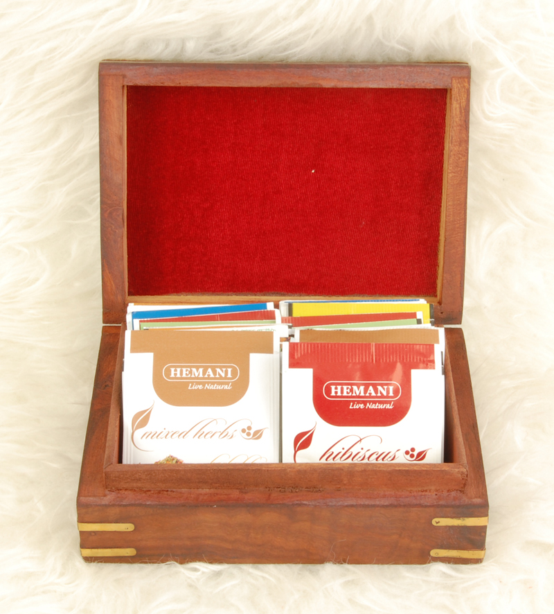 Jolie boite au bois avec un assortiment des thés et tisanes de la marque Hemani, plus de 30 sachets.