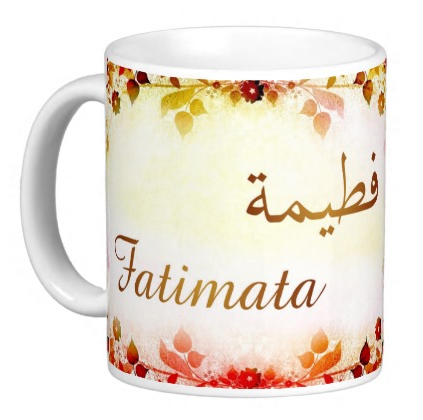 Mug avec le prénom "Fatimata" écrit en français, en arabe (فطيمة) et calligraphié de façon artistique en arabe sur la partie droite.