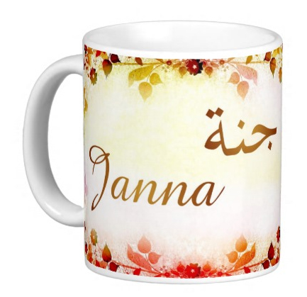 Mug avec le prénom "Janna" écrit en français, en arabe (جنة) et calligraphié de façon artistique en arabe sur la partie droite.