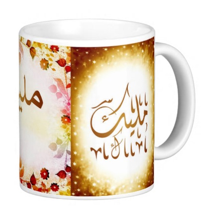 Mug avec le prénom "Malik" écrit en français, en arabe (مليك) et calligraphié de façon artistique en arabe sur la partie droite