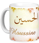 Mug avec le prénom "Menel" écrit en français, en arabe (منال) et calligraphié de façon artistique en arabe sur la partie droite.