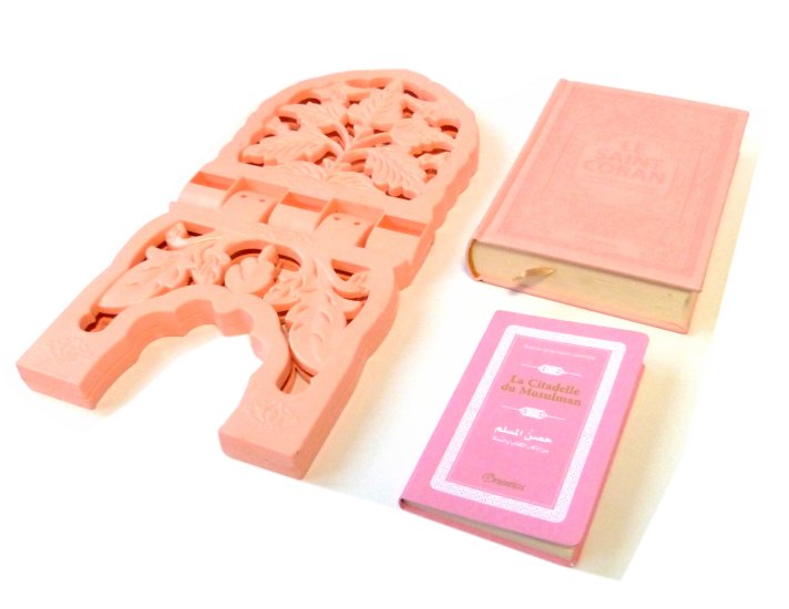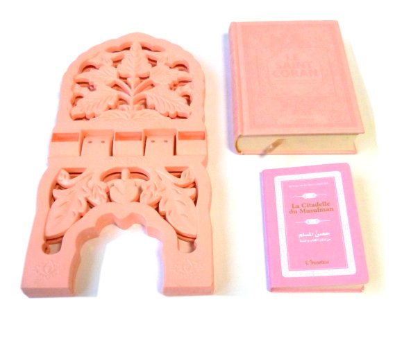 Pack cadeau rose pour femmes : Le Saint Coran (francais/arabe/phonetique) + La Citadelle du Musulman + Porte coran (assortis)