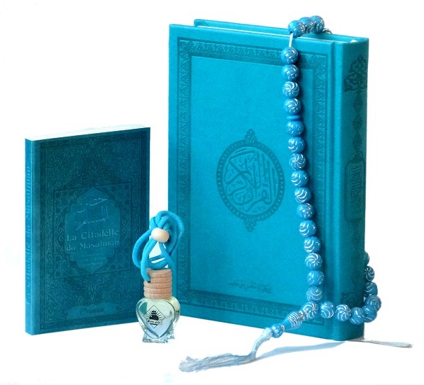 Pack Cadeau Bleu pour Femme : Coran français-arabe-phonétique, La Citadelle du musulman, Porte-Coran et parfum "Aïcha" - REF. 25656 (39.90 €) |