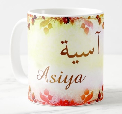 Mug avec le prénom "Asiya" écrit en français, en arabe (آسية) et calligraphié de façon artistique en arabe sur la partie droite.