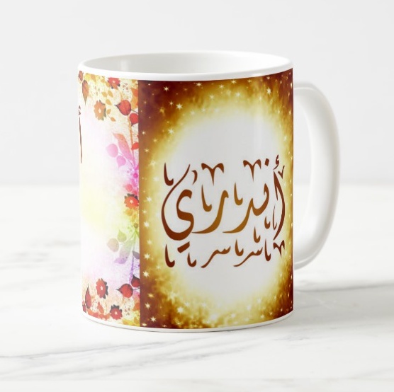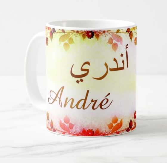 Mug avec le prénom "André" écrit en français, en arabe (أندري) et calligraphié de façon artistique en arabe sur la partie droite.