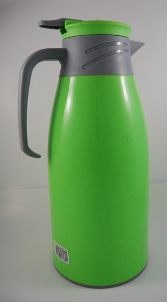 Thermos en plastique verte de capacité de 1,9L. le couvercle dispose d'un bouton à pression pour ouvrir le bec verseur afin de verser de la boisson, puis une fois le bouton relâché le bec verseur est à nouveau fermé, et la boisson reste isolée à la même température (quelle soit chaude ou froide).