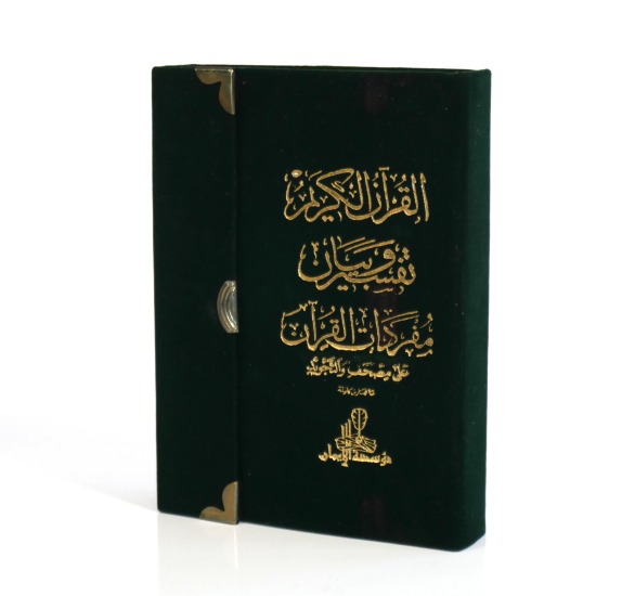 Le Saint Coran avec règles de lectures en couleur et explications des termes en arabe sur le côté. Couverture en daim qui se referme comme dans une boite pour le protéger lors du transport.