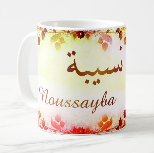 Mug avec le prénom Noussayba calligraphié en arabe ainsi que son écriture normale en arabe (نسيبة) et en français.