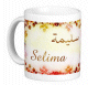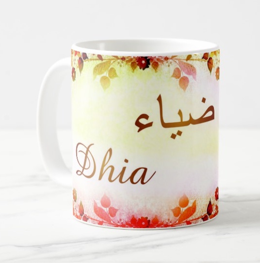 Mug avec le prénom Dhia calligraphié en arabe ainsi que son écriture normale en arabe (ضياء) et en français.