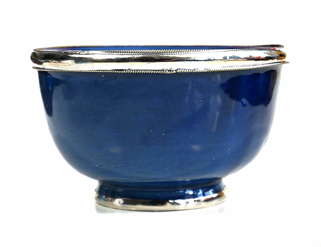 Grand bol en poterie marocain de couleur bleu petrole emaille et cercle de metal argente