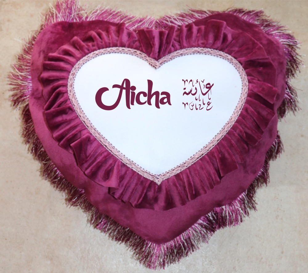 Taie d'oreiller en velours couleur violet en forme de coeur - Housse de coussin de luxe decoree personnalisee (prenom, message...)