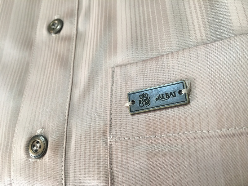Qamis de marque Albai de couleur beige foncé avec bandes de couleur bleu gris au niveau des épaules. Version avec boutons métalliques cuivrées visibles.