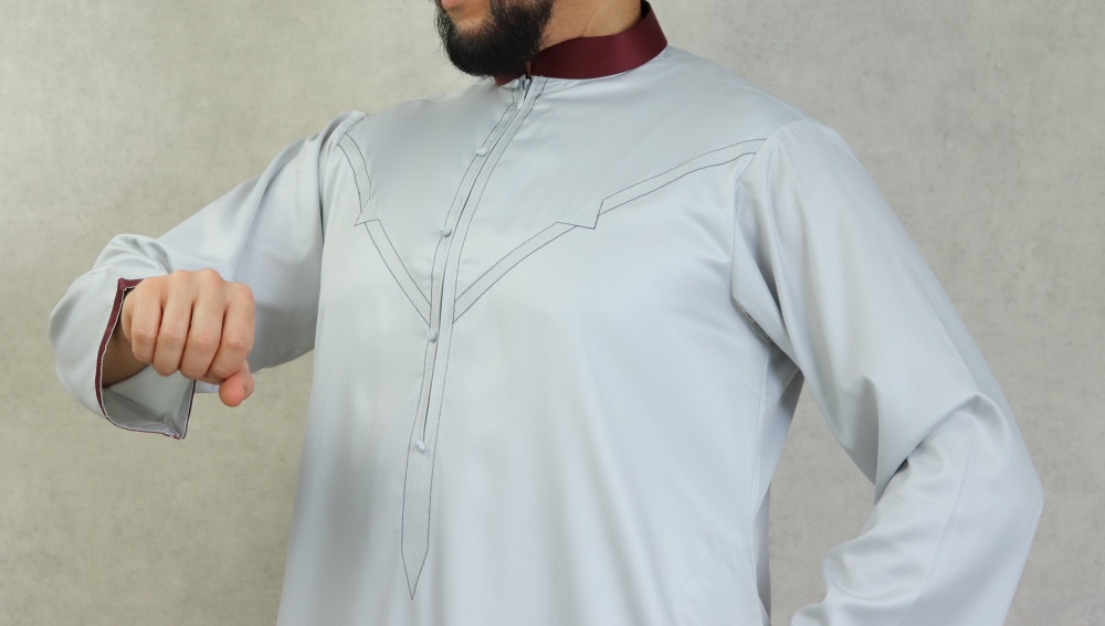 Qamis de couleur gris clair satiné avec broderies sur la poitrine sur les manches. Col et poignets de couleur grenat foncé.
