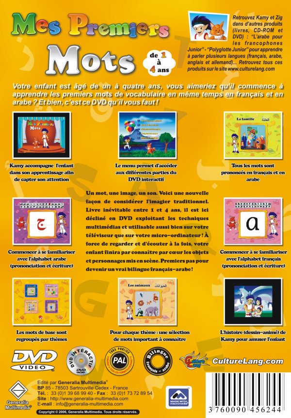 Un mot, une image, un son. Voici une nouvelle façon de considérer l'imagier traditionnel. Livre inévitable entre 1 et 4 ans, il est ici décliné en DVD exploitant les techniques multimédias et utilisable aussi bien sur votre téléviseur que sur votre micro-ordinateur ! À force de regarder et d'écouter à la fois, votre enfant finira par connaître par cœur les objets et personnages mis en scène. Premiers pas pour devenir un vrai bilingue français-arabe !